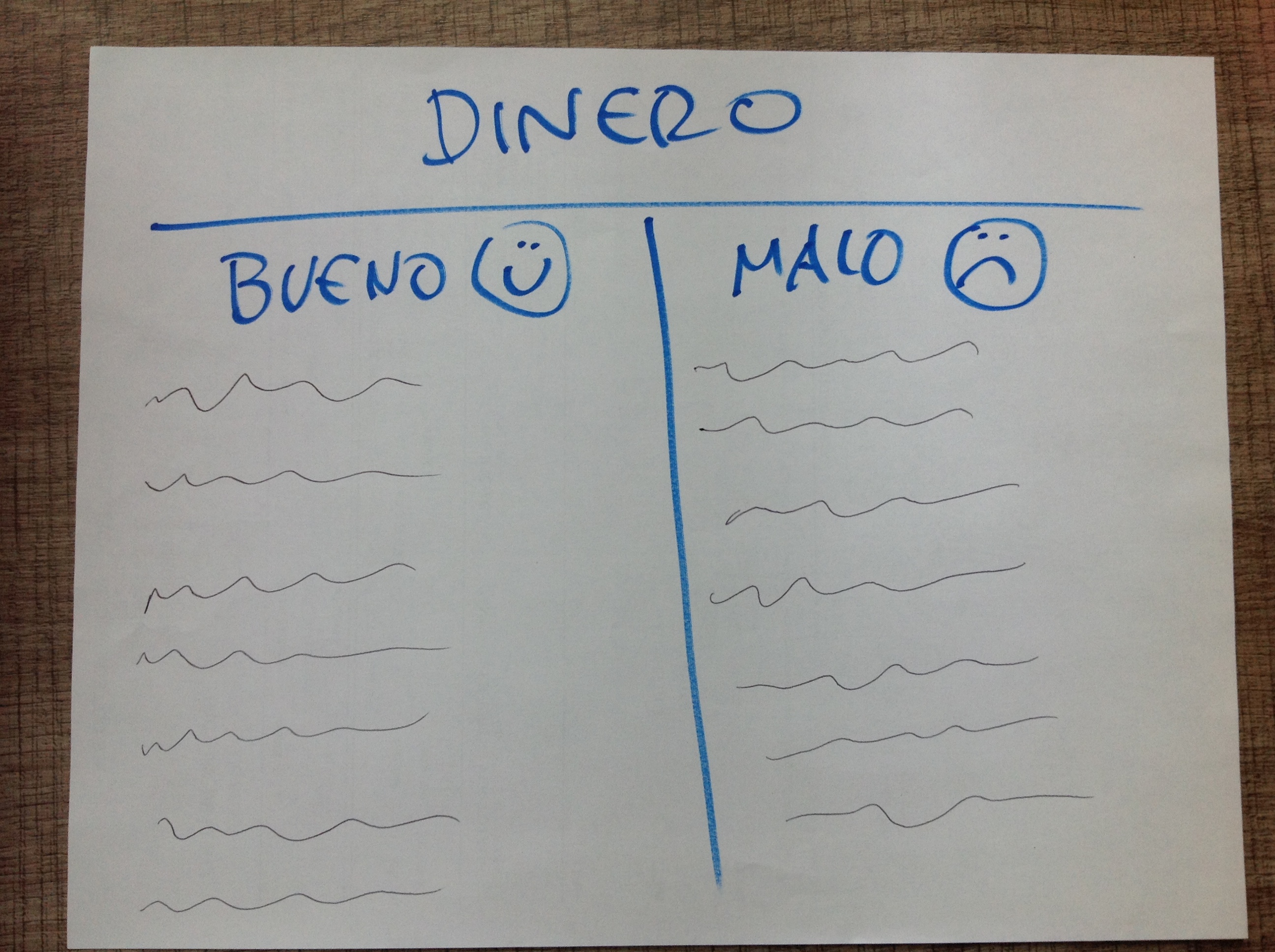 1. Primero, revisa qué piensas sobre el dinero, qué juicios tienes sobre esta idea. Toma una hoja, traza una línea divisoria en el medio y en una columna escribe lo que te parece “bueno” del dinero y en la otra lo que te parece “malo”; ya te he dado algunas pistas sobre esto. No te ocultes nada, finalmente esto es para que te des cuenta.