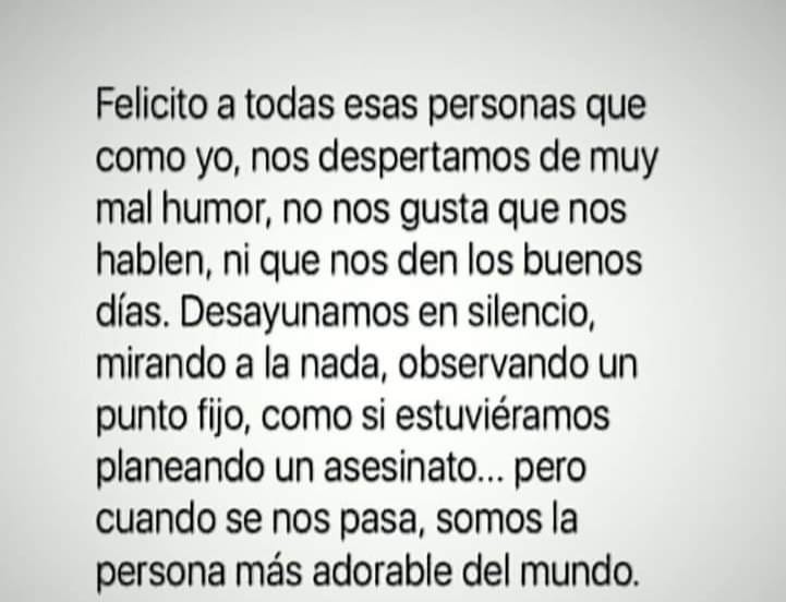 Para muchos de nosotros la mañana es un momento detestable. Despertar es antinatural, madrugar atenta contra los ritmos naturales, ser esclavos del despertador le hace daño al cuerpo (según un estudio que me acabo de inventar…). No entiendo cómo hay gente que está feliz, animada y sonriente en la mañana justo después de levantarse, ¿qué será lo que celebran?, ¿qué alegría encontrarán en todo esto? ¿Será una forma de masoquismo?, ¿cómo harán para forzar su cuerpo de esa manera?